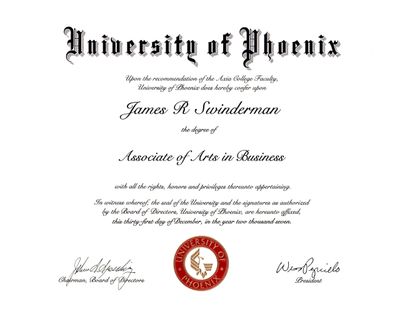 I hold a Associates of Arts in Business, conferred upon me on December 31, 2007, by University of Phoenix.